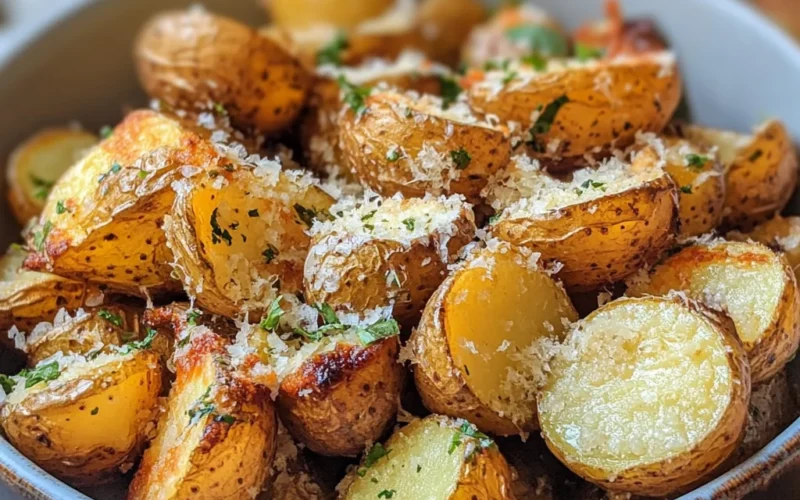 These Crispy Crunchy Parmesan Potatoes are a mouthwatering blend of golden-brown potato wedges coated in a savory mix of garlic, herbs, and fresh parmesan